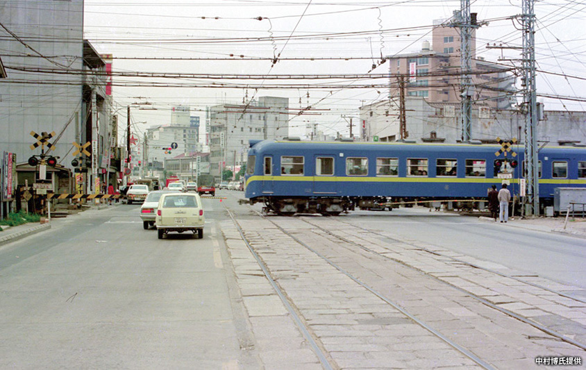 「九州鉄道」開業より3年後の1927(昭和2)年、福岡市内の路面電車を運行していた「九州水力電気」が城南線を開通させ、両線は「薬院踏切」において全国的にも数少ない鉄道・軌道が平面交差する場所となった。「薬院踏切」付近には、城南線に「城東橋電停」が、「九州鉄道」に「薬院駅」が開設され乗換駅に。1942(昭和17)年、両路線とも「西鉄」の経営となり、西鉄大牟田線と西鉄福岡市内線の城南線になった。1975(昭和50)年の城南線廃止に伴い、この平面交差は解消された。