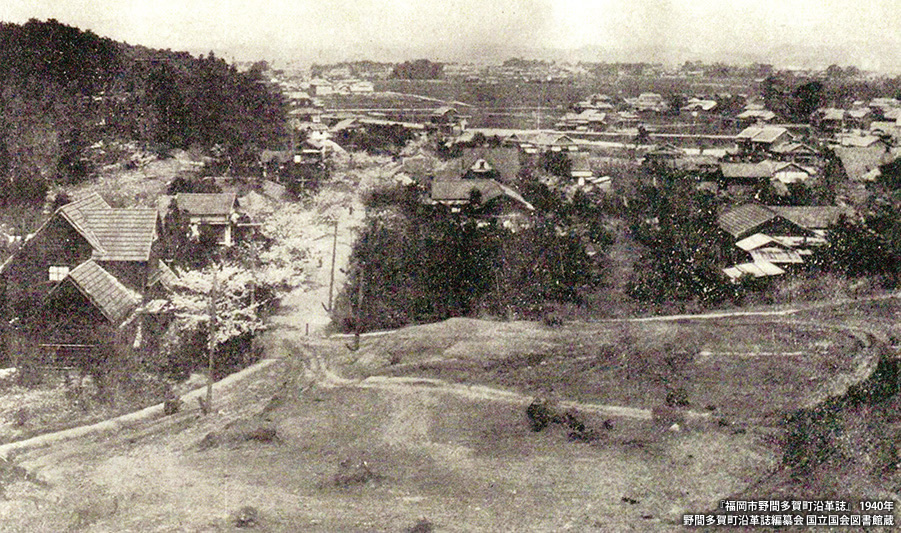 「九州鉄道」は福岡市の官庁街・業務地区である天神へ直通することもあり、沿線では住宅地開発が進められた。「福岡県庁」職員の住宅組合が開発した住宅地「野間文化村」もその一つ。「九州鉄道」の計画が進められていた1921(大正10)年、「高宮駅」予定地近くが建設地として選定され、「九州鉄道」開通の翌年、1925(大正14)年に竣工となった。この一帯は現在も閑静な住宅地となっている。