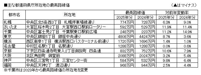都道府県庁所在地の最高路線価では東京都中央区の銀座中央通り(鳩居堂前)が40年連続で全国トップとなり、前年比プラス8.7%と3年連続で上昇しました。さいたま市の大宮駅西口駅前ロータリー(11.9%)と千葉市の千葉駅東口駅前広場(11.2%)は、ともに2年連続で二桁の上昇率です。