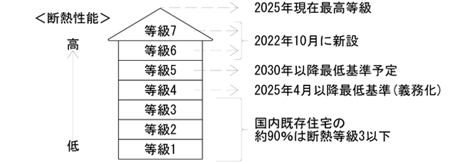 断熱等級の正式名称は「断熱等性能等級」といって、住まいの断熱性能がどのくらいかを示します。等級には1~7の段階があり、数字が大きいほど断熱性能が高いことを示しています。これは、気候変動問題への解決に向けての取り組みのひとつです。先の断熱性能を上げることで、エネルギー消費に伴う排出する炭素量を減らし、将来的な脱炭素化をめざしている施策です。 その一段階として今年(2025年)の4月より新築住宅はすべて、断熱等級は「4以上」が最低基準と義務づけられました。