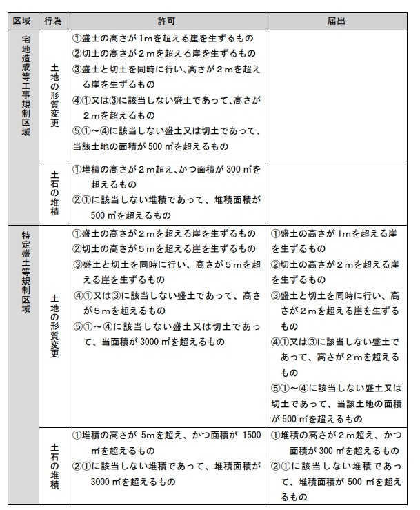 宅地造成等工事規制区域及び特定盛土等規制区域内において、政令で定める「土地の形質変更」及び「土石の堆積」行為を行う場合には、あらかじめ都道府県知事による許可または届出が必要となります。工事の許可申請では、(ⅰ)工事の技術的基準、(ⅱ)工事主の資力と信用、(ⅲ)工事施行者の能力、(ⅳ)土地の所有者等の同意の有無、について審査を行います。また、一定規模の工事について、中間検査・定期報告・完了検査が義務付けられています。同法における規制対象となる工事は、下記表の通りですが、各自治体の条例により規制対象規模等を強化することが認められており、工事に際しては各自治体の条例を確認する必要があります。