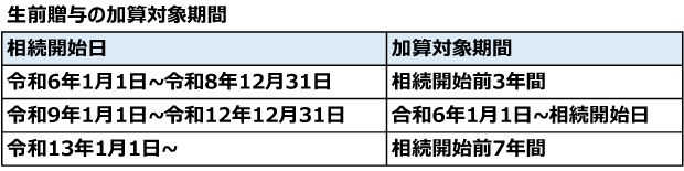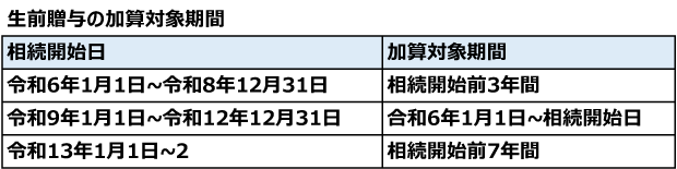 (注) 2024年(令和6年)1月1日以後に受けた贈与については、相続税の課税価格に加算する期間が3年間から7年間(この7年間とは、その相続の日から遡って7年目の応当日からその相続開始の日までの間をいいます。)に延長されていますが、この期間延長は法改正以後の贈与が対象となるため、加算対象となる期間は下表のとおりとなります。