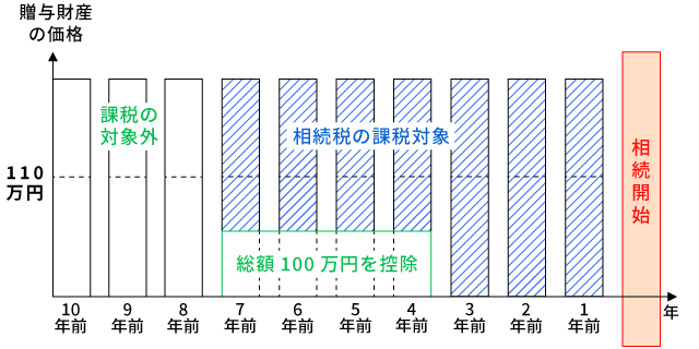 ・ 生前贈与加算の対象となるもののうち、相続開始前3年以内に取得した財産以外の財産(相続開始前3年超~7年以内に取得した財産)については、相続税の課税価格に加算する際にその財産の贈与時の価額の合計額から総額100万円を控除します(詳しくは後述します。)。