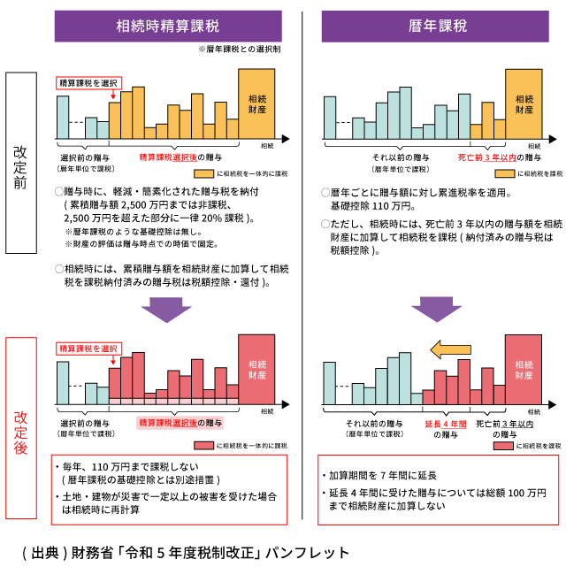 また、相続時精算課税を選択した受贈者が、その選択に係る贈与者から令和6年1月1日以後に贈与により取得した財産に係るその年分の贈与税については、暦年課税の基礎控除とは別に、贈与税の課税価格から基礎控除額110万円が控除されることとされ、その贈与者の死亡に係る相続税の課税価格に加算される贈与財産の価額も、令和6年1月1日以後の贈与分については、基礎控除額110万円を控除した後の残額とされました。