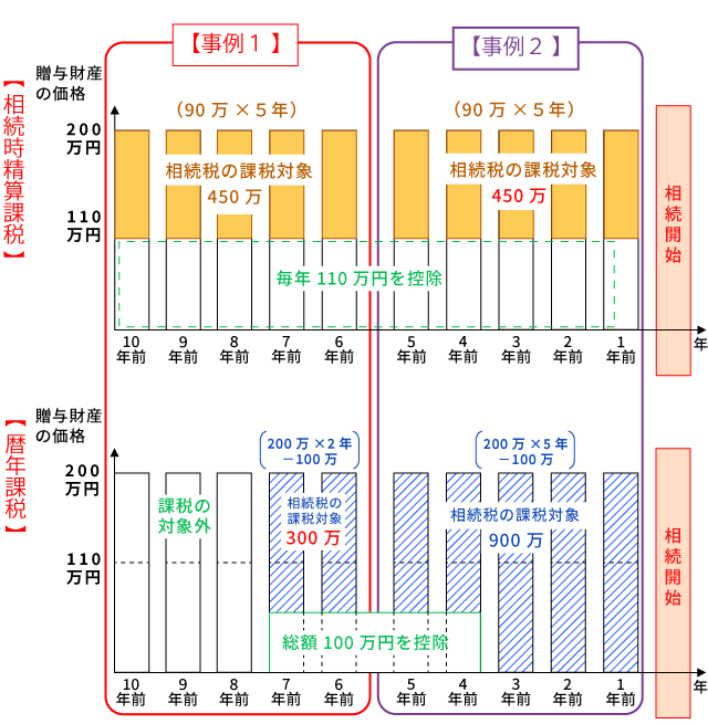 次の2パターンの比較で明らかなように、生前贈与の開始時期によって加算額は大きく異なることとなります。